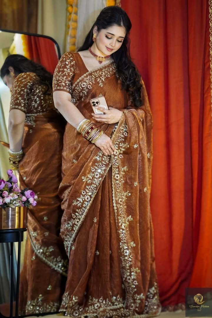 অপূর্ব কপার শেডের এই টিস্যু সিল্ক শাড়ি দিয়ে আপনার বিশেষ দিনটিকে করুন আরও উজ্জ্বল। শাড়িটির গর্জিয়াস বর্ডার এবং নিখুঁত জারদোসি কাজ আপনাকে দিবে এক রাজকীয় লুক। উৎসব বা বিয়ের দাওয়াতের জন্য এটি একটি মাস্ট-হ্যাভ কালেকশন!